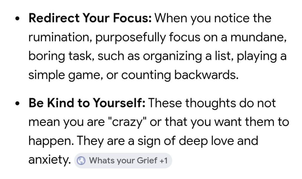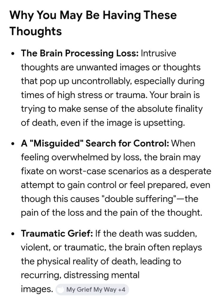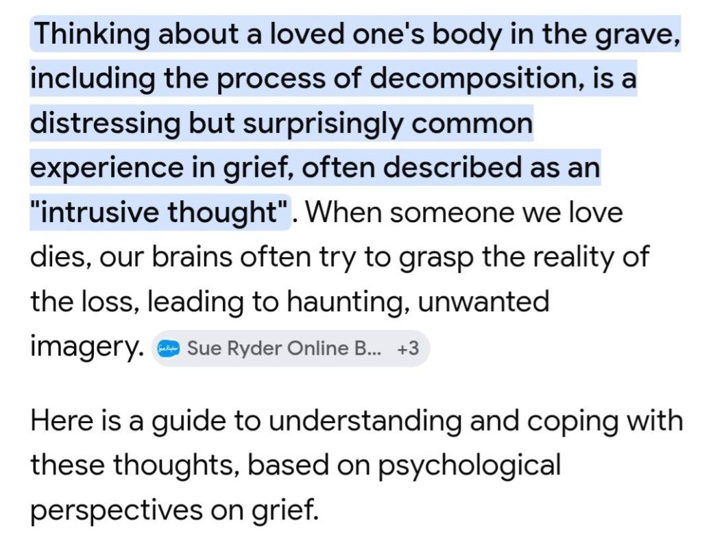 Nige, so the whole me thinking about you decaying in your grave thing can be a normal part of grief apparently, who knew ? Did a trusty google search and below is some of the stuff that came up.